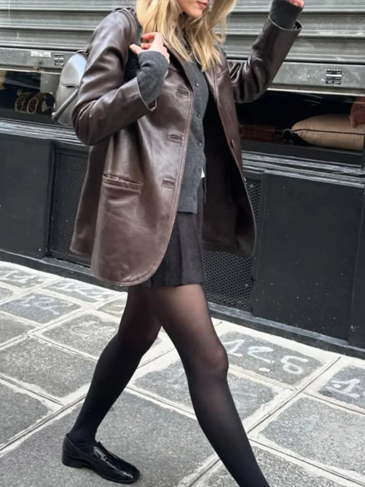 Vintage Women PU Leather Jackets Oversized Turn Down Collar Long Sleeve Zipper